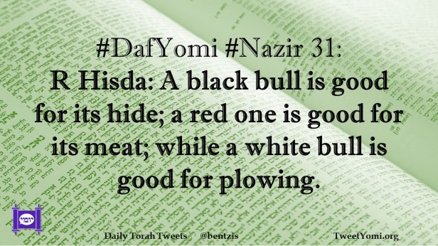 DafYomi, Nazir #DafYomi #Nazir 31 Date: March 19, 2023Author: netanelspitz #DafYomi #Nazir 31: R Hisda: A black bull is good for its hide; a red one is good for its meat; while a white bull is good for plowing. Share this: Share on X (Opens in new window) X Share on Facebook (Opens in new window) Facebook Like Loading... Related