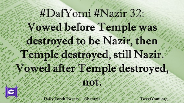 DafYomi, Nazir #DafYomi #Nazir 32 Date: March 19, 2023Author: netanelspitz #DafYomi #Nazir 32: Vowed before Temple was destroyed to be Nazir, then Temple destroyed, still Nazir. Vowed after Temple destroyed, not. Share this: Share on X (Opens in new window) X Share on Facebook (Opens in new window) Facebook Like Loading... Related