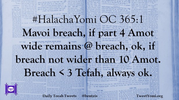 #HalachaYomi OC 365:1 Mavoi breach, if part 4 Amot wide remains @ breach, ok, if breach not wider than 10 Amot. Breach < 3 Tefah, always ok.
