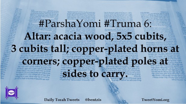 #ParshaYomi #Truma 6: Altar: acacia wood, 5×5 cubits, 3 cubits tall; copper-plated horns at corners; copper-plated poles at sides to carry.
