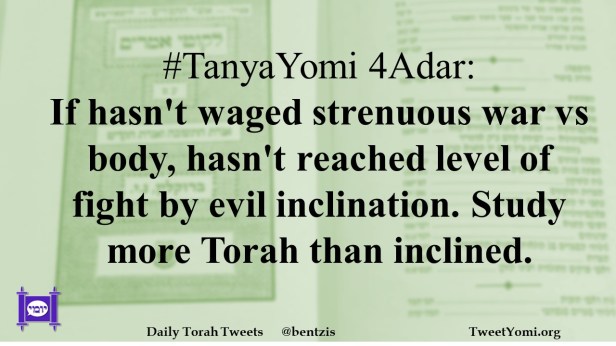 #TanyaYomi 4Adar: If hasn’t waged strenuous war vs body, hasn’t reached level of fight by evil inclination. Study more Torah than inclined.