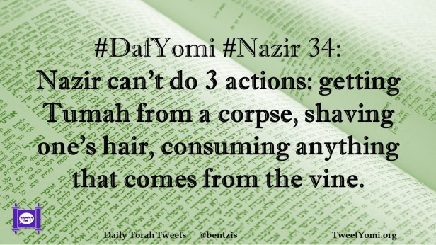 DafYomi, Nazir #DafYomi #Nazir 34 Date: March 20, 2023Author: netanelspitz #DafYomi #Nazir 34: Nazir can’t do 3 actions: getting Tumah from a corpse, shaving one’s hair, consuming anything that comes from the vine. Share this: Share on X (Opens in new window) X Share on Facebook (Opens in new window) Facebook Like Loading... Related