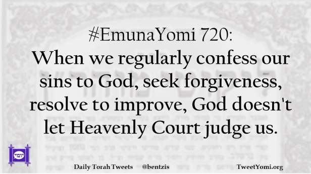 #EmunaYomi 720: When we regularly confess our sins to God, seek forgiveness, resolve to improve, God doesn’t let Heavenly Court judge us.