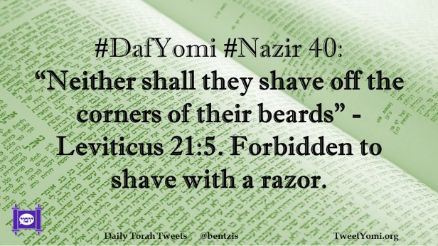 DafYomi, Nazir #DafYomi #Nazir 40 Date: March 21, 2023Author: netanelspitz #DafYomi #Nazir 40: “Neither shall they shave off the corners of their beards” -Leviticus 21:5. Forbidden to shave with a razor. Share this: Share on X (Opens in new window) X Share on Facebook (Opens in new window) Facebook Like Loading... Related