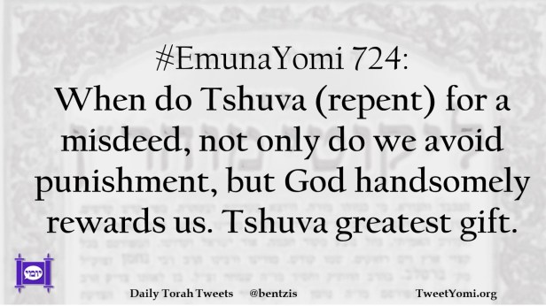 #EmunaYomi 724: When do Tshuva (repent) for a misdeed, not only do we avoid punishment, but God handsomely rewards us. Tshuva greatest gift.