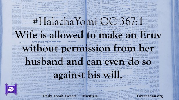 #HalachaYomi OC 367:1 Wife is allowed to make an Eruv without permission from her husband and can even do so against his will.