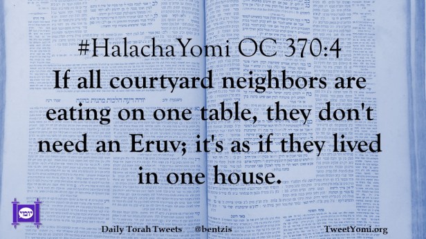 #HalachaYomi OC 370:4 If all courtyard neighbors are eating on one table, they don’t need an Eruv; it’s as if they lived in one house.