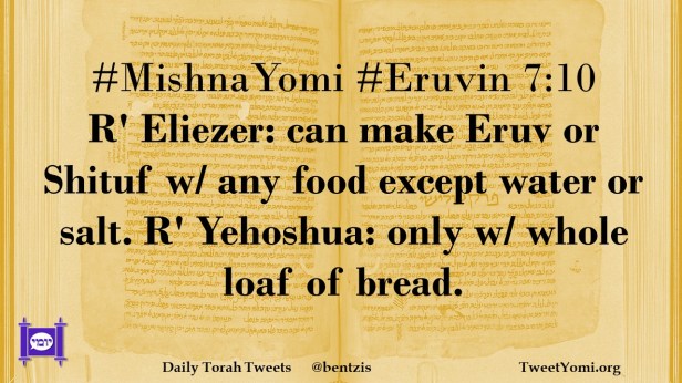 #MishnaYomi #Eruvin 7:10 R’ Eliezer: can make Eruv or Shituf w/ any food except water or salt. R’ Yehoshua: only w/ whole loaf of bread.