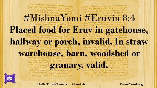 #MishnaYomi #Eruvin 8:4 Placed food for Eruv in gatehouse, hallway or porch, invalid. In straw warehouse, barn, woodshed or granary, valid.