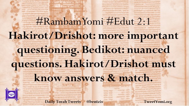 #RambamYomi #Edut 2:1 Hakirot/Drishot: more important questioning. Bedikot: nuanced questions. Hakirot/Drishot must know answers & match.