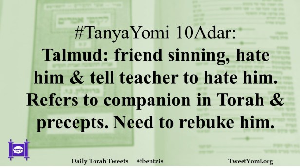 #TanyaYomi 10Adar: Talmud: friend sinning, hate him & tell teacher to hate him. Refers to companion in Torah & precepts. Need to rebuke him.
