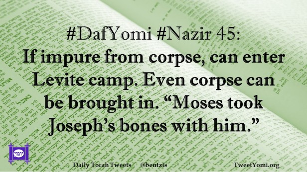 DafYomi, Nazir #DafYomi #Nazir 45 Date: March 22, 2023Author: netanelspitz #DafYomi #Nazir 45: If impure from corpse, can enter Levite camp. Even corpse can be brought in. “Moses took Joseph’s bones with him.” Share this: Share on X (Opens in new window) X Share on Facebook (Opens in new window) Facebook Like Loading... Related