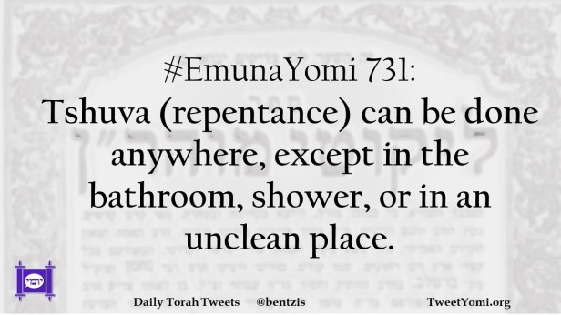 EmunaYomi #EmunaYomi 731 Date: March 22, 2023Author: netanelspitz #EmunaYomi 731: Tshuva (repentance) can be done anywhere, except in the bathroom, shower, or in an unclean place. Share this: Share on X (Opens in new window) X Share on Facebook (Opens in new window) Facebook Like Loading... Related