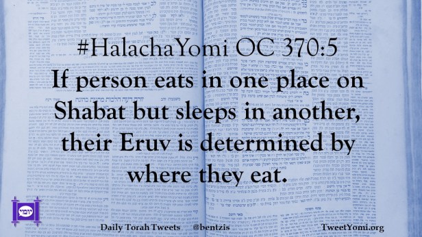 #HalachaYomi OC 370:5 If person eats in one place on Shabat but sleeps in another, their Eruv is determined by where they eat.