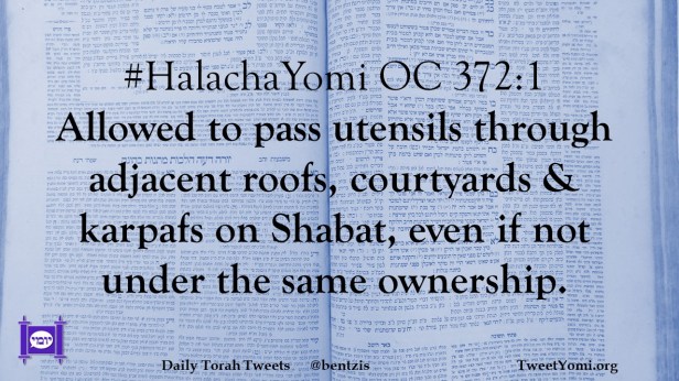 #HalachaYomi OC 372:1 Allowed to pass utensils through adjacent roofs, courtyards & karpafs on Shabat, even if not under the same ownership.