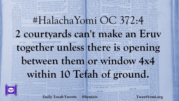 #HalachaYomi OC 372:4 2 courtyards can’t make an Eruv together unless there is opening between them or window 4×4 within 10 Tefah of ground.
