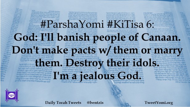 #ParshaYomi #KiTisa 6: God: I’ll banish people of Canaan. Don’t make pacts w/ them or marry them. Destroy their idols. I’m a jealous God.