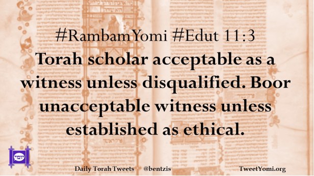 #RambamYomi #Edut 11:3 Torah scholar acceptable as a witness unless disqualified. Boor unacceptable witness unless established as ethical.