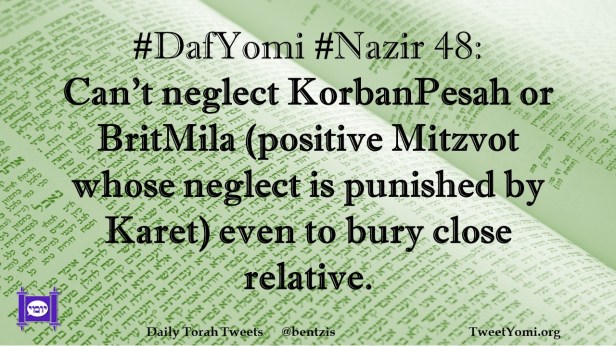 DafYomi, Nazir #DafYomi #Nazir 48 Date: March 23, 2023Author: netanelspitz #DafYomi #Nazir 48: Can’t neglect KorbanPesah or BritMila (positive Mitzvot whose neglect is punished by Karet) even to bury close relative. Share this: Share on X (Opens in new window) X Share on Facebook (Opens in new window) Facebook Like Loading... Related