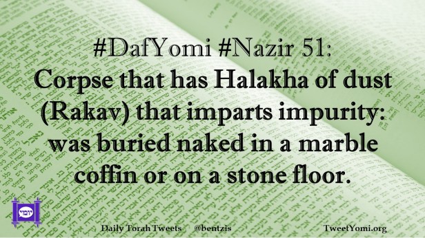 DafYomi, Nazir #DafYomi #Nazir 51 Date: March 23, 2023Author: netanelspitz #DafYomi #Nazir 51: Corpse that has Halakha of dust (Rakav) that imparts impurity: was buried naked in a marble coffin or on a stone floor. Share this: Share on X (Opens in new window) X Share on Facebook (Opens in new window) Facebook Like Loading... Related