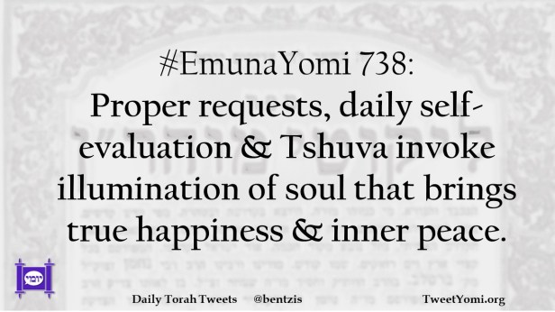 #EmunaYomi 738: Proper requests, daily self-evaluation & Tshuva invoke illumination of soul that brings true happiness & inner peace.