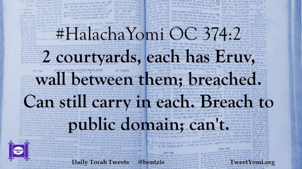 #HalachaYomi OC 374:2 2 courtyards, each has Eruv, wall between them; breached. Can still carry in each. Breach to public domain; can’t.