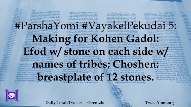 #ParshaYomi #VayakelPekudai 5: Making for Kohen Gadol: Efod w/ stone on each side w/ names of tribes; Choshen: breastplate of 12 stones.