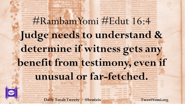#RambamYomi #Edut 16:4 Judge needs to understand & determine if witness gets any benefit from testimony, even if unusual or far-fetched.