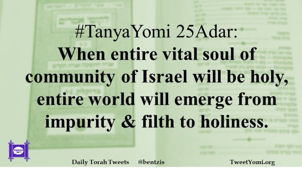#TanyaYomi 25Adar: When entire vital soul of community of Israel will be holy, entire world will emerge from impurity & filth to holiness.