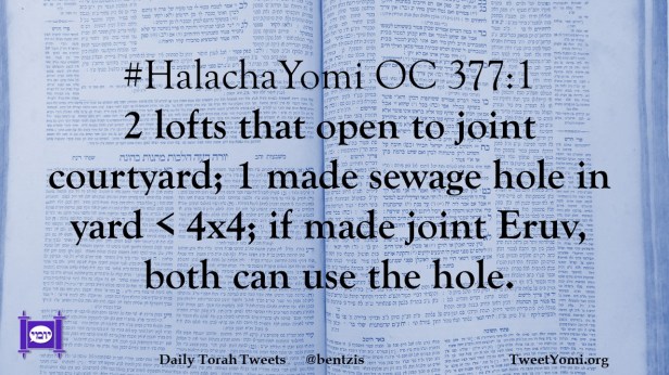 #HalachaYomi OC 377:1 2 lofts that open to joint courtyard; 1 made sewage hole in yard < 4×4; if made joint Eruv, both can use the hole.