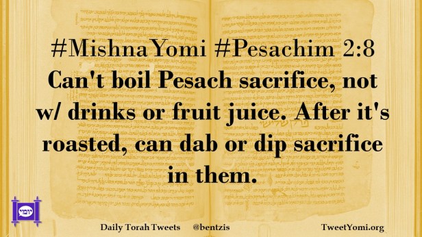 #MishnaYomi #Pesachim 2:8 Can’t boil Pesach sacrifice, not w/ drinks or fruit juice. After it’s roasted, can dab or dip sacrifice in them.