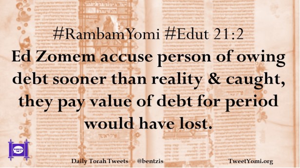 #RambamYomi #Edut 21:2 Ed Zomem accuse person of owing debt sooner than reality & caught, they pay value of debt for period would have lost.