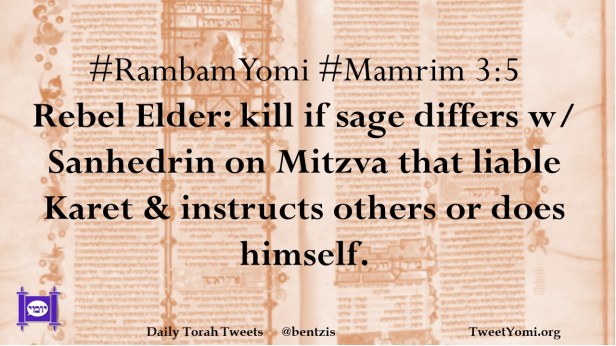 #RambamYomi #Mamrim 3:5 Rebel Elder: kill if sage differs w/ Sanhedrin on Mitzva that liable Karet & instructs others or does himself.