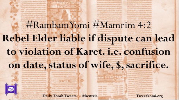 #RambamYomi #Mamrim 4:2 Rebel Elder liable if dispute can lead to violation of Karet. i.e. confusion on date, status of wife, $, sacrifice.