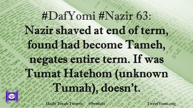 DafYomi, Nazir #DafYomi #Nazir 63 Date: March 30, 2023Author: netanelspitz #DafYomi #Nazir 63: Nazir shaved at end of term, found had become Tameh, negates entire term. If was Tumat Hatehom (unknown Tumah), doesn’t. Share this: Share on X (Opens in new window) X Share on Facebook (Opens in new window) Facebook Like Loading... Related