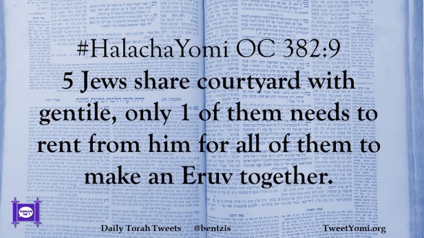#HalachaYomi OC 382:9 5 Jews share courtyard with gentile, only 1 of them needs to rent from him for all of them to make an Eruv together.