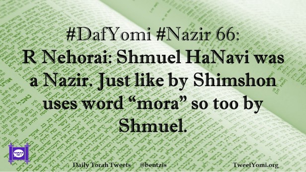DafYomi, Nazir #DafYomi #Nazir 66 Date: April 2, 2023Author: netanelspitz #DafYomi #Nazir 66: R Nehorai: Shmuel HaNavi was a Nazir. Just like by Shimshon uses word “mora” so too by Shmuel. Share this: Share on X (Opens in new window) X Share on Facebook (Opens in new window) Facebook Like Loading... Related