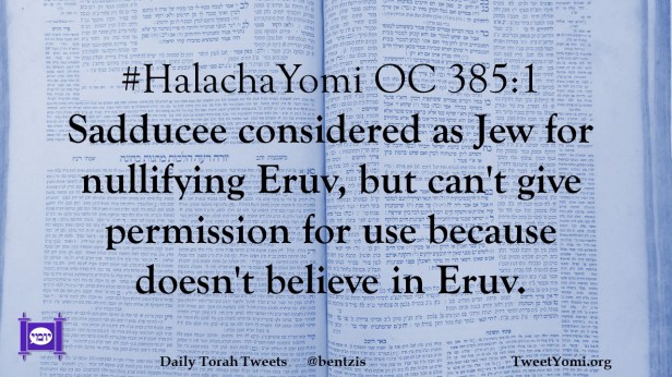 #HalachaYomi OC 385:1 Sadducee considered as Jew for nullifying Eruv, but can’t give permission for use because doesn’t believe in Eruv.