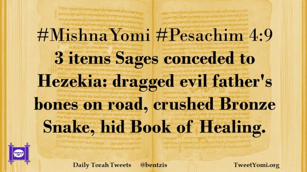 #MishnaYomi #Pesachim 4:9 3 items Sages conceded to Hezekia: dragged evil father’s bones on road, crushed Bronze Snake, hid Book of Healing.