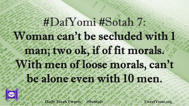 DafYomi, Sotah #DafYomi #Sotah 7 Date: April 9, 2023Author: netanelspitz #DafYomi #Sotah 7: Woman can’t be secluded with 1 man; two ok, if of fit morals. With men of loose morals, can’t be alone even with 10 men. Share this: Share on X (Opens in new window) X Share on Facebook (Opens in new window) Facebook Like Loading... Related