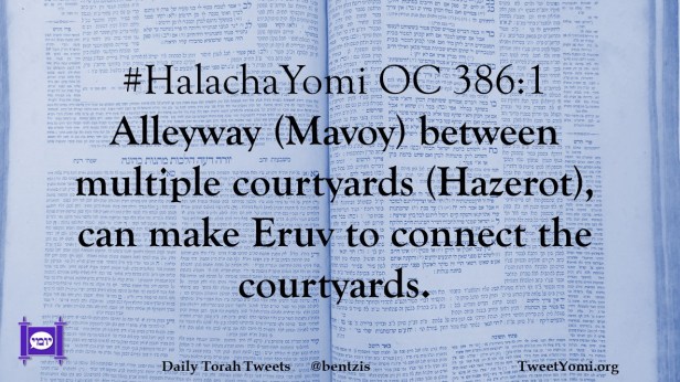 HalachaYomi #HalachaYomi OC 386:1 Date: April 9, 2023Author: netanelspitz #HalachaYomi OC 386:1 Alleyway (Mavoy) between multiple courtyards (Hazerot), can make Eruv to connect the courtyards. Share this: Share on X (Opens in new window) X Share on Facebook (Opens in new window) Facebook Like Loading... Related