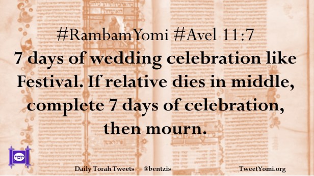 #RambamYomi #Avel 11:7 7 days of wedding celebration like Festival. If relative dies in middle, complete 7 days of celebration, then mourn.