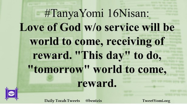 #TanyaYomi 16Nisan: Love of God w/o service will be world to come, receiving of reward. “This day” to do, “tomorrow” world to come, reward.