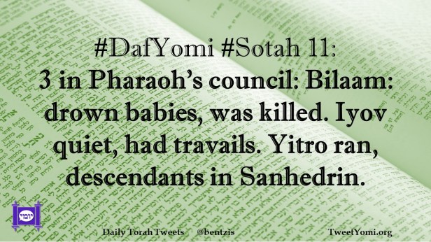 DafYomi, Sotah #DafYomi #Sotah 11 Date: April 13, 2023Author: netanelspitz #DafYomi #Sotah 11: 3 in Pharaoh’s council: Bilaam: drown babies, was killed. Iyov quiet, had travails. Yitro ran, descendants in Sanhedrin. Share this: Share on X (Opens in new window) X Share on Facebook (Opens in new window) Facebook Like Loading... Related