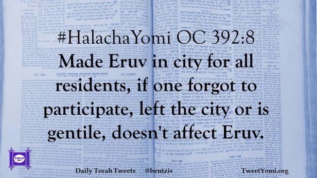 #HalachaYomi OC 392:8 Made Eruv in city for all residents, if one forgot to participate, left the city or is gentile, doesn’t affect Eruv.