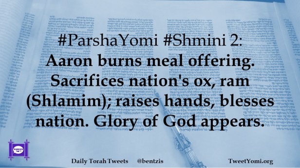 #ParshaYomi #Shmini 2: Aaron burns meal offering. Sacrifices nation’s ox, ram (Shlamim); raises hands, blesses nation. Glory of God appears.