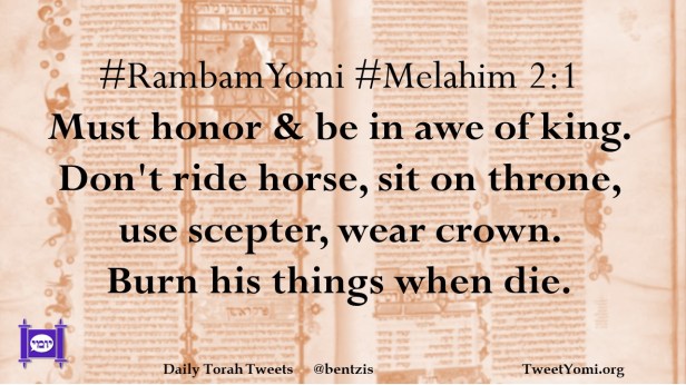 #RambamYomi #Melahim 2:1 Must honor & be in awe of king. Don’t ride horse, sit on throne, use scepter, wear crown. Burn his things when die.