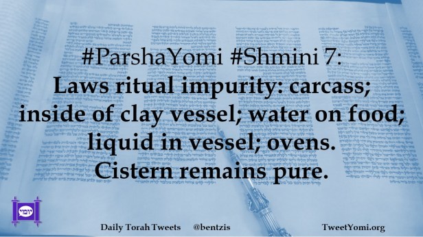 #ParshaYomi #Shmini 7: Laws ritual impurity: carcass; inside of clay vessel; water on food; liquid in vessel; ovens. Cistern remains pure.