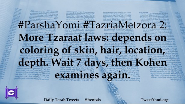 #ParshaYomi #TazriaMetzora 2: More Tzaraat laws: depends on coloring of skin, hair, location, depth. Wait 7 days, then Kohen examines again.