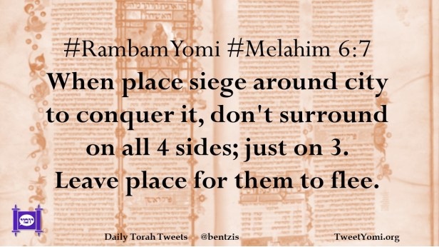 #RambamYomi #Melahim 6:7 When place siege around city to conquer it, don’t surround on all 4 sides; just on 3. Leave place for them to flee.